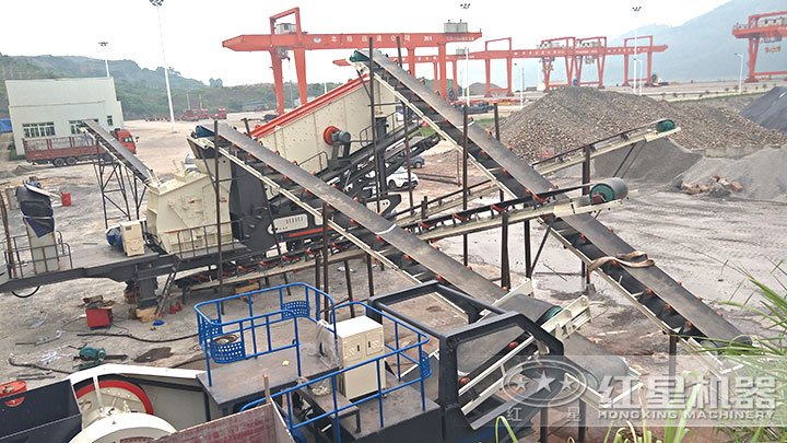 1、配置錘式破碎機、振動給料機、振動篩的“三合一”移動破碎站作業現場,一次成型,簡化工藝流程,降低投資成本,成品粒型好、市場需求大。