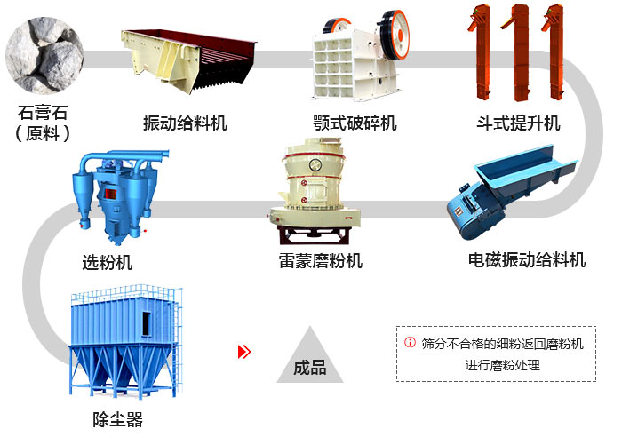 大塊的石膏石原料在給料機的作用下,并均勻、連續的送入顎式破碎機進行粗碎加工,破碎后的石膏石在斗式提升機的作用下被送入料倉,之后由電磁振動給料機均勻、定量的送到雷蒙磨粉機進行磨粉加工,經磨粉后的粉末在鼓風機的租用下吹向分析機進行分選,分選后的物料由廣島輸送到大旋風收粉器,后經出料口輸出。